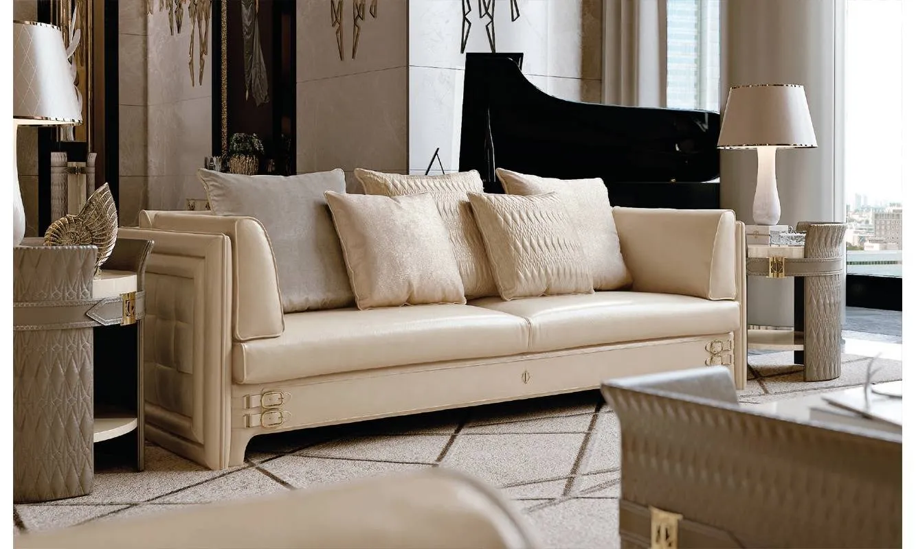Диван со структурой из дерева. Полностью обит в кожу и ткань. Декорирован ремнями по периметру основания. Возможны другие виды обивки.