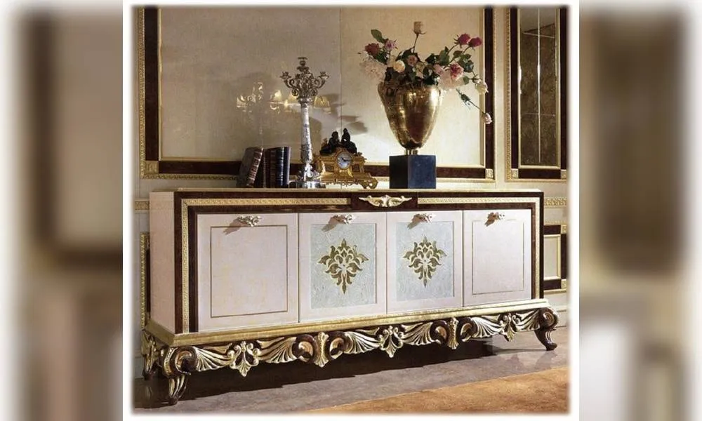 4-х дверный комод. Декорирован резьбой. Центральные дверцы из окрашенного стекла с декорацией из золотой фольги. Декор ручной работы. Возможны другие цветовые варианты отделки.