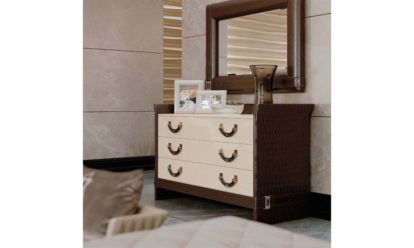 Комод со структурой из дерева. Частично обит кожей. Возможен заказ изделия с мраморной столешницей и другие варианты отделки и обивки.