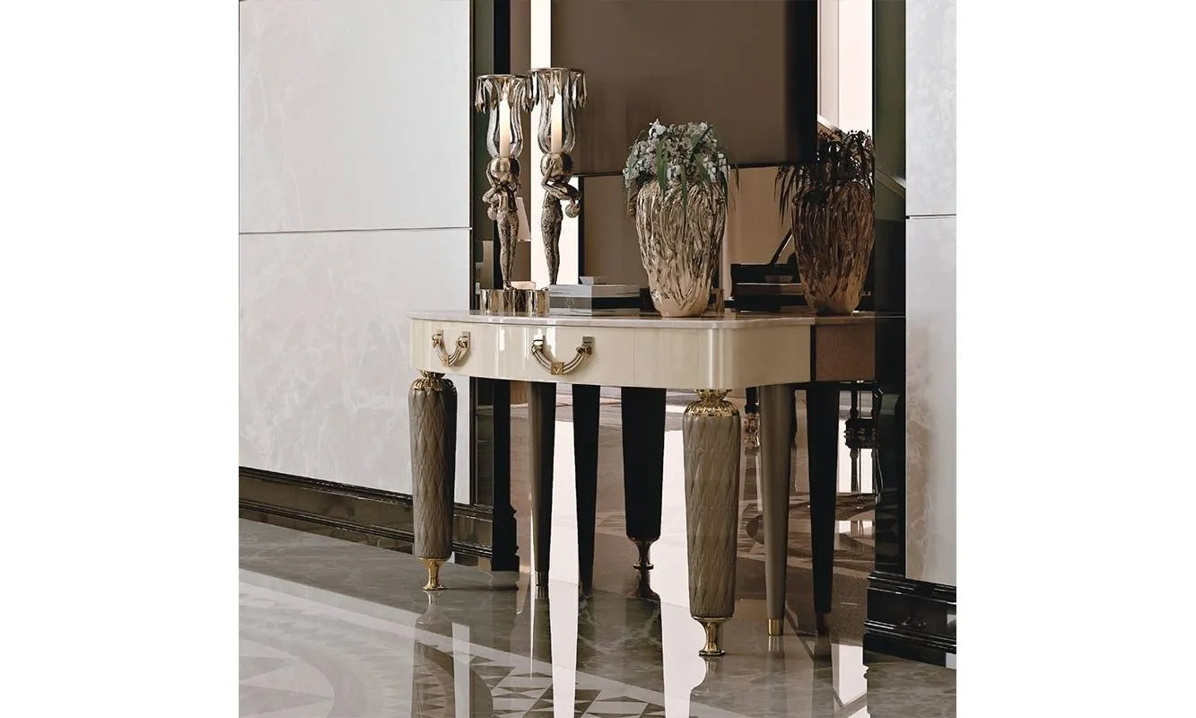 Консоль со структурой из дерева, передние ножки обиты в кожу. Декорирование выполнено вручную. Возможны другие виды отделки и обивки и заказ изделия с мраморным топом.
