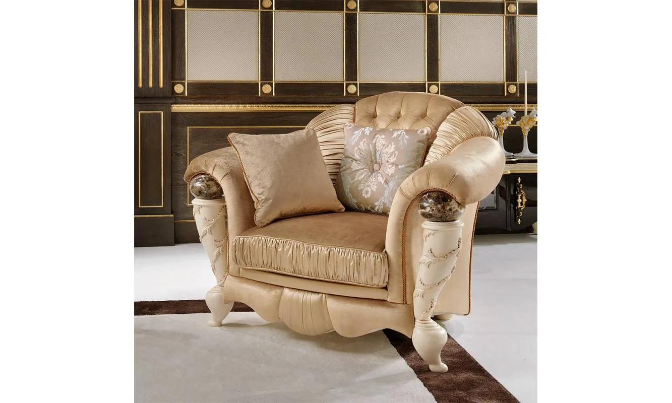 Кресло на деревянном основании, декорировано резьбой. На подлокотниках установлены мраморные сферы, ножки выполнены с матовым финишем. Обивка может быть из кожи разных видов.