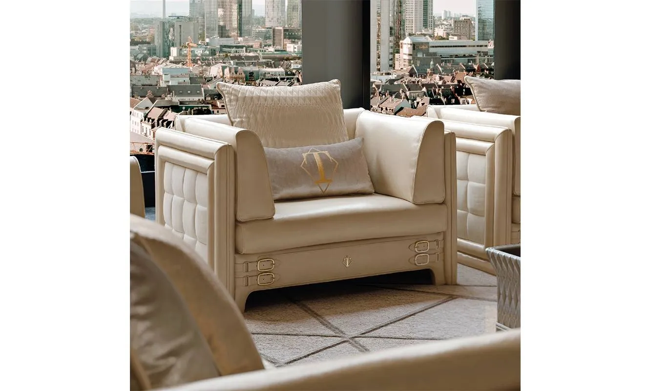 Кресло со структурой из дерева. Полностью обито в кожу и ткань. Декорировано ремнями по периметру основания. Возможны другие виды обивки.
