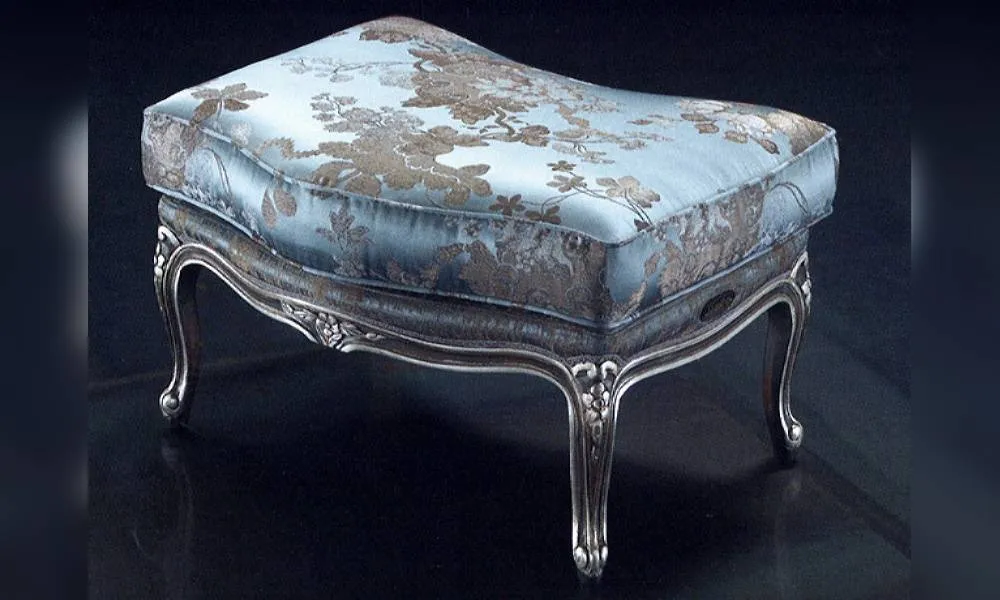 Прямоугольный пуф с обитым сидением. Украшен резьбой. Возможны другие варианты отделки и обивки, в том числе в ткани клиента.