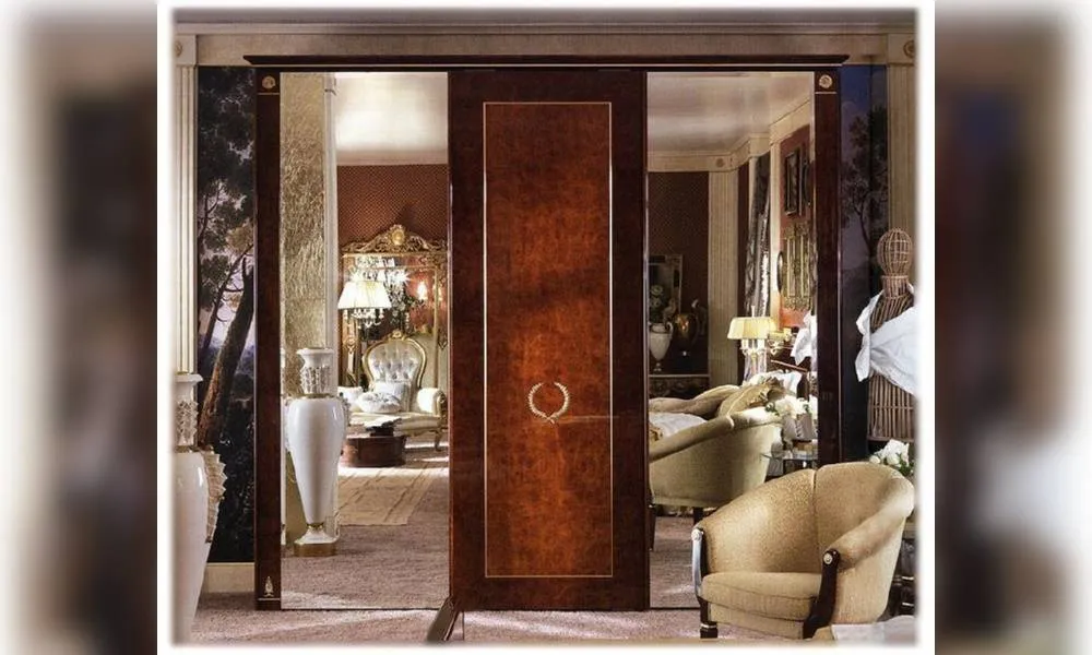 Шкаф с 3 раздвижными дверцами. Боковые дверцы с гравированным фацетным зеркалом. По запросу возможно все 3 дверцы зеркальные или деревянные. Внутреннее оснащение заказывается дополнительно. Декор ручной работы. Возможны другие варианты отделки.