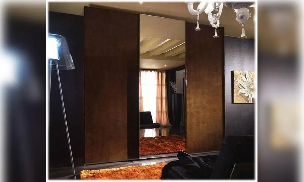 Шкаф с 3-мя раздвижными дверями и зеркальной центральной дверью. Внутреннее оснащение: 3 деревянные полки и 3 вешалки. Декор ручной работы. Возможны другие цветовые варианты отделки.
