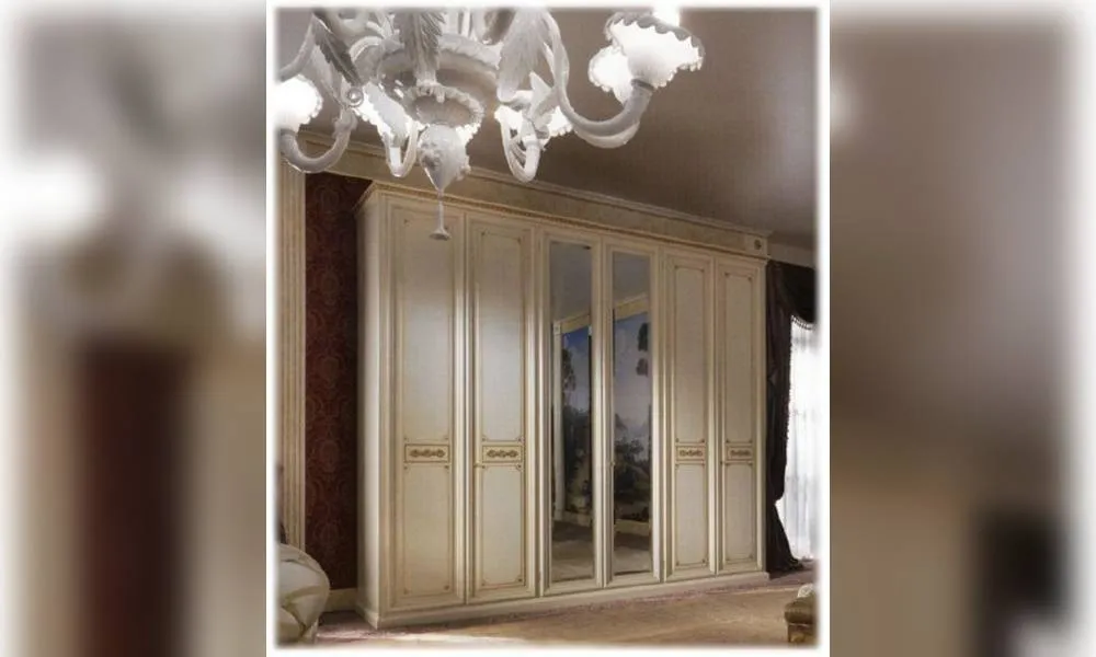 Шкаф с 6-ю распашными дверцами на замке. 2 центральные дверцы зеркальные с периметральным фацетным. По запросу возможно все 6 дверцы зеркальные или деревянные. Внутреннее оснащение: 3 полки и 4 золоченных вешалки. Декор ручной работы. Возможны другие цветовые варианты отделки.