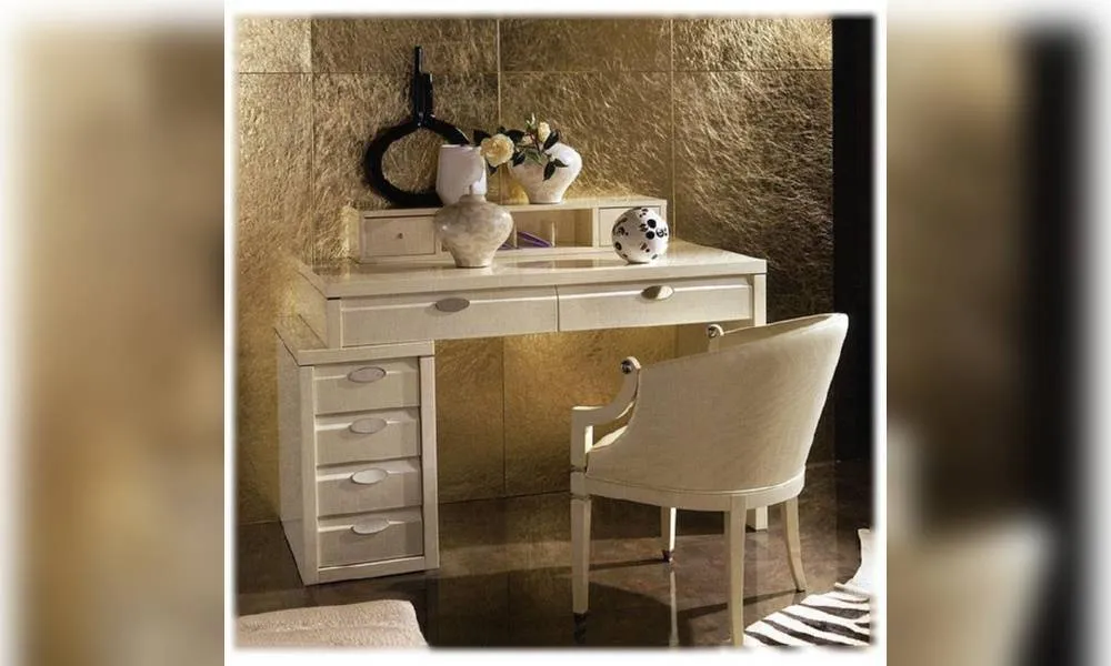 Письменный стол с 8-ю выдвижными ящиками и открытой полкой. Декорирован кожаной аппликацией. Декор ручной работы. Возможны другие цветовые варианты отделки и кожи.