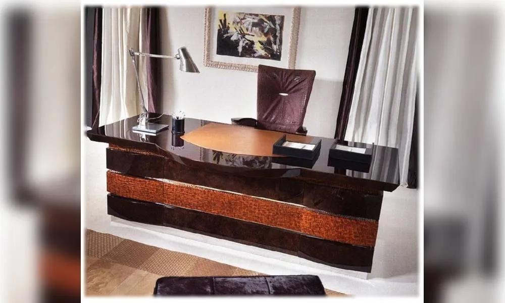 Письменный стол c 6-ю ящиками. Декорирован кожаной аппликацией. Декор ручной работы. Возможны другие цветовые варианты отделки.