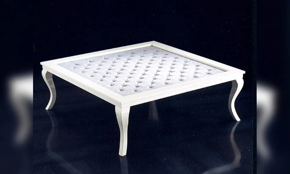 Квадратный журнальный стол. Топ обит в технике капитоне. Возможны другие варианты отделки и обивки, в том числе в ткани клиента.