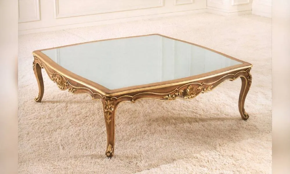 Квадратный журнальный стол. Столешница выполнена из стекла. Декорирован резными элементами.