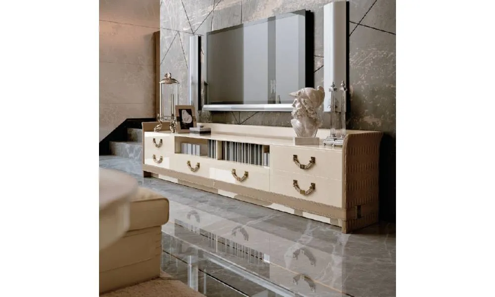 Тумба под ТВ с деревянной структурой, декорирована вручную. Отдельные элементы обиты кожей. Возможны другие варианты отделки и обивки и заказ изделия с мраморным топом.