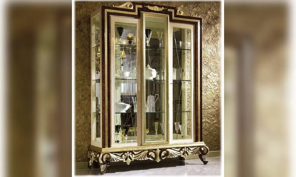 2-х дверная витрина. Декоририрована резьбой. Центральная панель со стеклом. Зеркальная задняя стенка. Внутренние полки выполнены из стекла. Галогеновая подсветка в верхней плоскости по желанию заказчика. Декор ручной работы. Возможны другие цветовые варианты отделки.